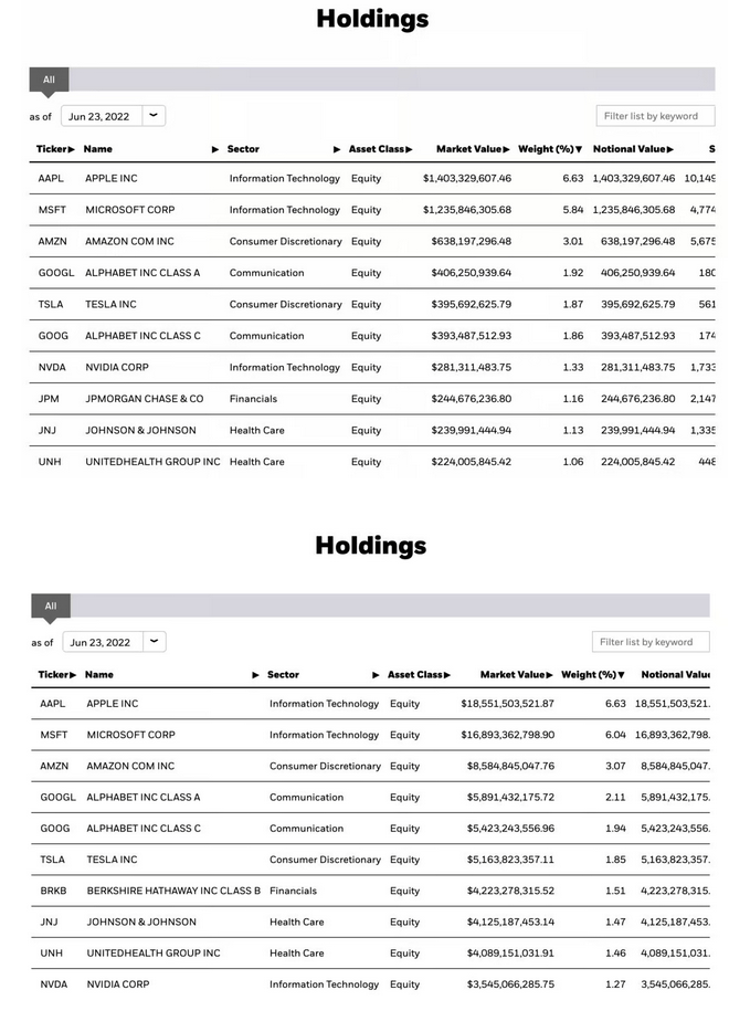 Environmental, Social, and Governance. No one actually knows what any of that means, but you can throw that label on your fund, change your website’s color to a shade of light green, and instantly charge 5x higher expense ratios. Don’t believe me? Let me show you two ETFs: the first is BlackRock’s iShares ESG Aware MSCI USA ETF, while the second is BlackRock’s S&P 500 portfolio. Notice any major differences?