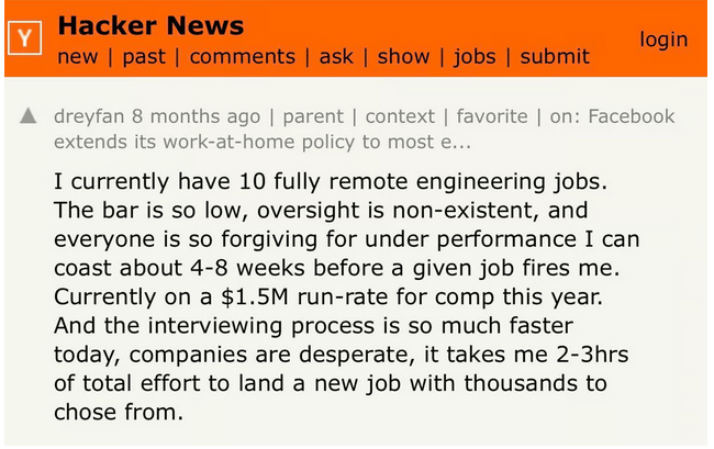 However, when you’re working from home, you can work from home for, hypothetically, as many companies as you want. You can have an Amazon laptop and an Apple laptop and a Google laptop and a Microsoft laptop and a bunch of other laptops, and you can earn like $100k+ from all of these jobs at the same time.