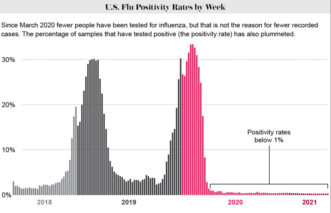 29. Since the beginning of 2020, the Flu has “disappeared”. In the United States, since February 2020, influenza cases have allegedly dropped by over 98%.