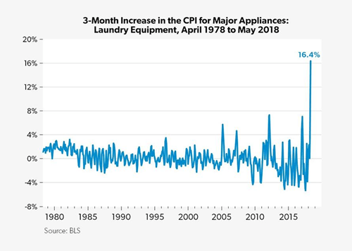 Stockman tells us: “In the three months after the United States imposed tariffs on washing machines to protect Whirlpool and other U.S. manufacturers, a decision at cross-currents and exacerbated by tariffs on imported steel and aluminum, prices for washing machines increased more rapidly than any three-month period in the 40-years data has been collected and those prices increased more than twice as fast as any of 300 other categories in the last two of those three months.”