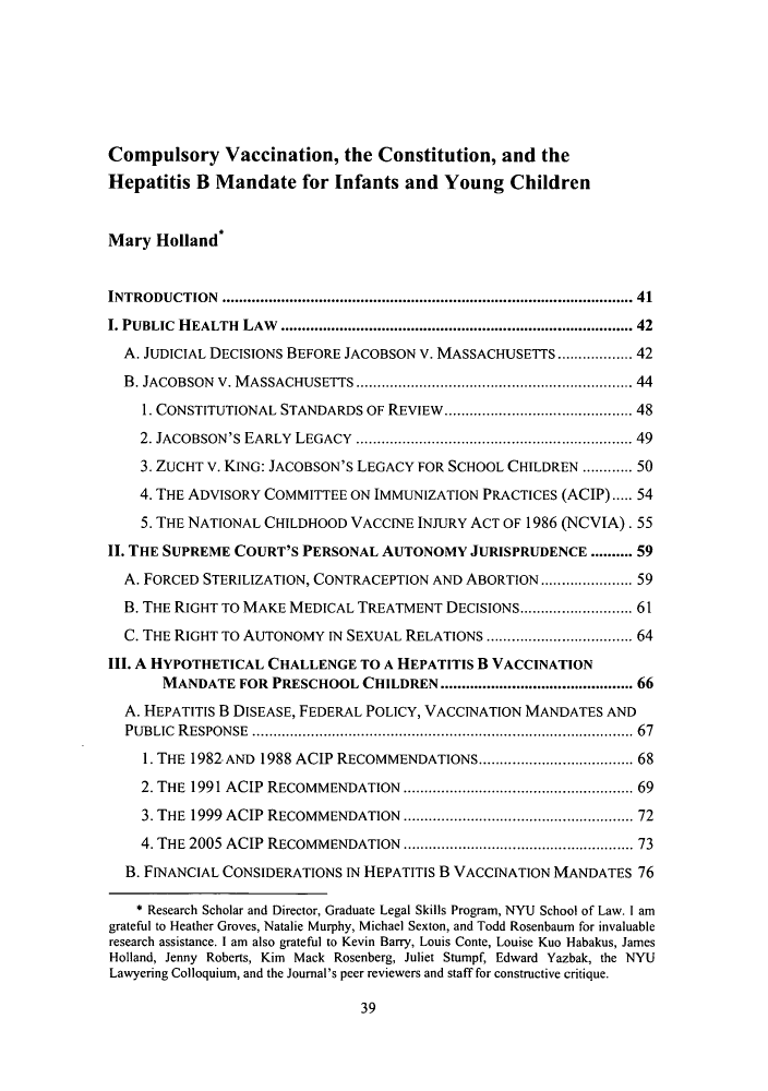 Ctrs. for Disease Control & Prevention, Hepatitis B Virus: A Comprehensive Strategy for Eliminating Transmission in the United States Through Universal Childhood Vaccination: Recommendations of the Immunization Practices Advisory Committee (ACIP), 40 MORBIDITY & MORTALITY WKLY. REP., Nov. 22, 1991, at 1, 2, available at http://www.cdc.gov/mmwr/preview/ mmwrhtmli/00033405.htm. 41 3 Holland: Compulsory Vaccination, the Constitution, and the Hepatitis B Mandate for Infants and Young Children Published by Yale Law School Legal Scholarship Repository, 2012 YALE JOURNAL OF HEALTH POLICY, LAW, AND ETHICS