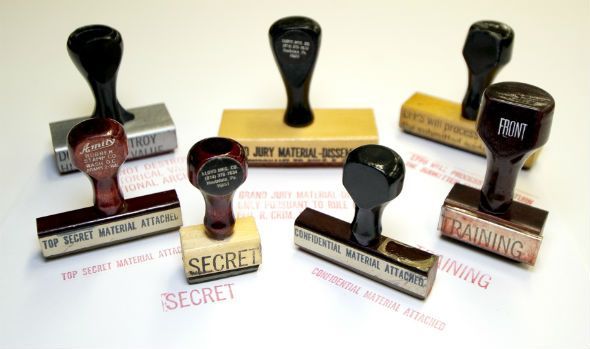 IMAGE: A collection of FBI rubber stamps used from the period of World War II up until relatively recently to indicate, for example, classification categories such as Unclassified or Top Secret or uses of documents, such as for grand jury proceedings.