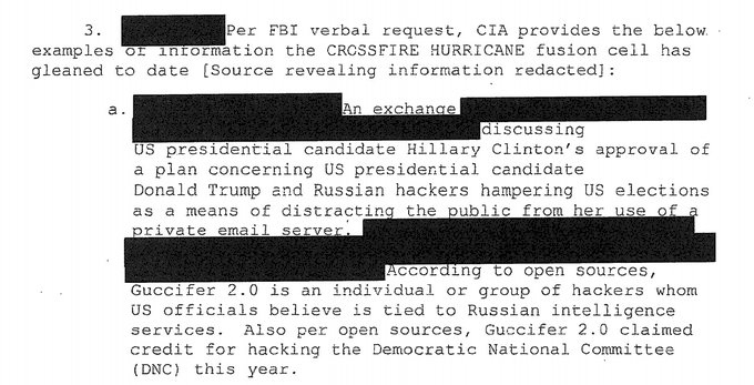 “Per FBI verbal request, CIA provides the below examples of information the CROSSFIRE HURRICANE fusion cell has gleaned to date,” the memo continued. ““An exchange [REDACTED] discussing US presidential candidate Hillary Clinton’s approval of a plan concerning US presidential candidate Donald Trump and Russian hackers hampering US elections as a means of distracting the public from her use of a private email server.”