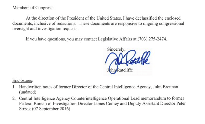 NEW: Ratcliffe has transmitted newly declassified documents to Congress… Brennan’s handwritten notes and a CIA memo to the FBI.
