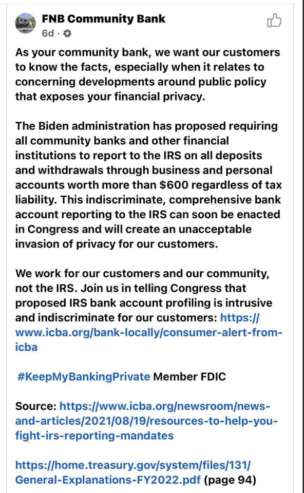 The Biden administration has proposed requiring all community banks and other financial institutions to report to the IRS on all deposits and withdrawals through business and personal accounts worth more than $600 regardless of tax liability. This indiscriminate, comprehensive bank account reporting to the IRS can soon be enacted in Congress and will create an unacceptable invasion of privacy for our customers.