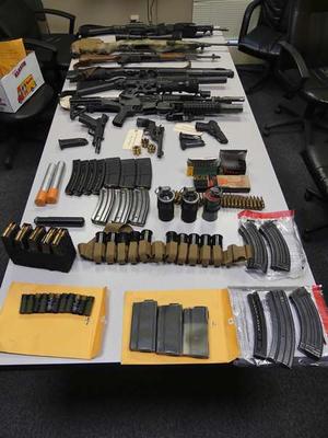 Bradley and Jennings were taken into custody and face multiple charges, including: 8 counts of possession of a large capacity firearm, 19 counts of possession of a large capacity feeding device, 3 counts of possession of a silencer, 8 counts of improper storage of a large capacity firearm, improper storage of a firearm, possession of a firearm without a license, possession of ammunition without a license and possession of a bump stock.