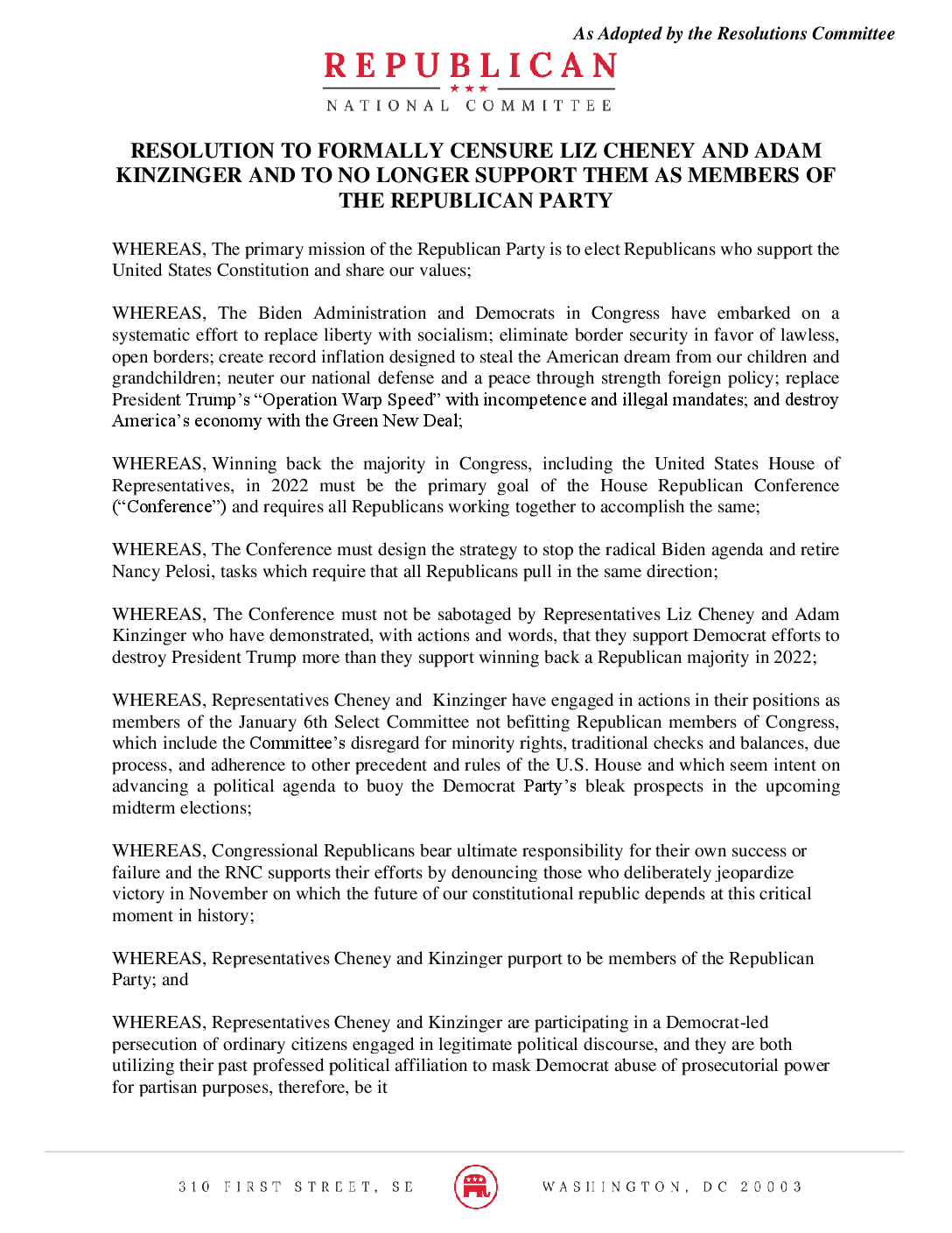 The Republican National Committee voted to censure Representatives Liz Cheney and Adam Kinzinger for participating in the inquiry into the deadly riot at the Capitol.