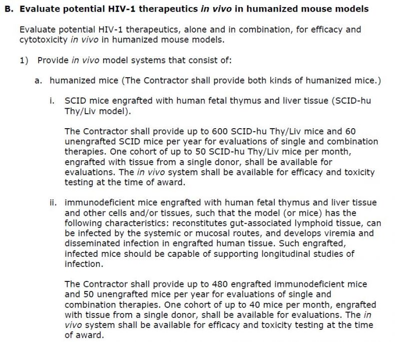 The Statement of Work for the “Humanized Mouse Models for HIV Therapeutics Development” contract says the contractor shall make one “cohort” per month of two types of humanized mice. Each of these (one numbering up to 50 mice and the other up to 40) will be made with human fetal thymus and liver tissue taken from “a single donor.”
