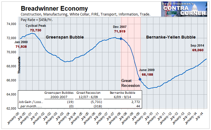 The starting point remains “breadwinner jobs” in construction, manufacturing, the white collar professions, business management, FIRE, distribution and transportation and core government excluding education—jobs which generate upwards of 40 hours per week of work and $50K per year of gross pay. As I have previously indicated, we are not even close to recovery of the breadwinner jobs lost during the Great Recession, or since the 2000-2001 peak for that matter.