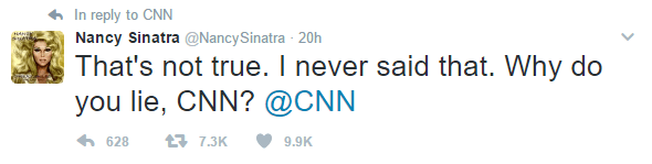 Responding to an article published by CNN originally entitled, “Nancy Sinatra not happy Trump using father’s song at inauguration,” the 76-year-old singer and actress replied, “That’s not true. I never said that. Why do you lie, CNN?”