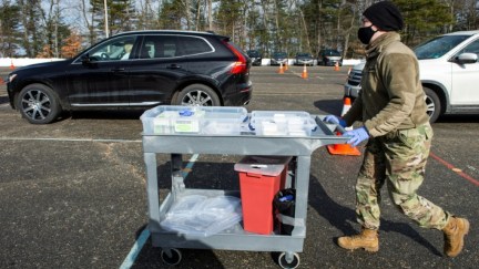 A U.S. National Guard soldier pushes a cart with syringes loaded with the Moderna COVID-19 vaccine at a vaccination center in Londonderry, N.H. (AFP)