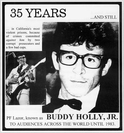 “That’s how I met P.F. and he’s the most wonderful, capable person I’ve ever known; he has the most excellent vocabulary. When this thing happened to him, he had several successful businesses; he had his own band that did a Buddy Holly tribute. He became known as Buddy Holly Jr. He taught sky-diving, he was a Realtor. I could go on and on. Anyway, there shouldn’t even have been a trial, let alone him being sent to prison; they gave him 17 years. And every year, just before a parole hearing, they write him up for a bunch of false rule violations. And then when he goes to his parole hearing, they say, ‘Oh, sorry, too many rule violations. We can’t release you.’”