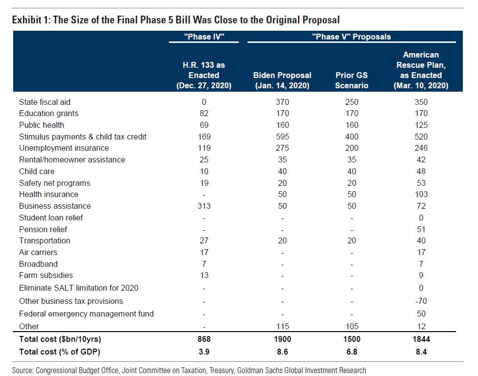 But first a quick post mortem from Goldman on the final Biden bill which as Goldman chief economist Jan Hatzius writes was closer to the original Biden proposal “than we expected” with the bank’s forecast of a $1.5 trillion (6.8% of GDP) package, was around $350bn (1.6% ofGDP) less than what Congress ultimately approved. Exhibit 1 compares Goldman’s prior expectations and the final package as estimated. Greater-than-expected fiscal support for state and local governments, transit systems and pension funds accounted for around half of the difference.