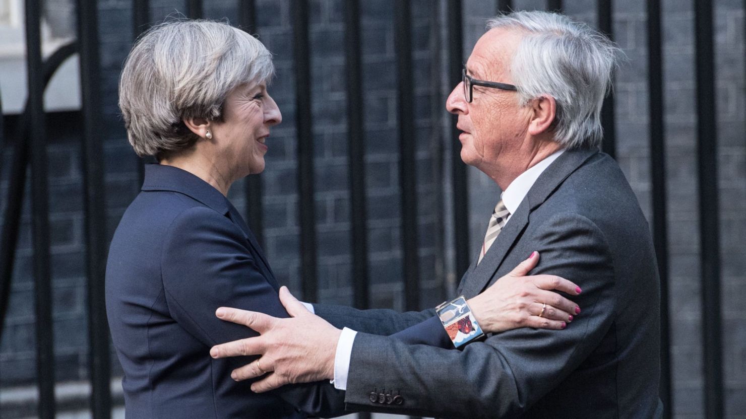 LONDON, ENGLAND – APRIL 26: Britain’s Prime Minister, Theresa May, greets European Commission president, Jean-Claude Juncker, as he arrives at 10 Downing Street on April 26, 2017 in London, England. Prime Minister May is to hold her first major talks with E.U leaders since calling a general election in a bid to strengthen her position in forthcoming Brexit negotiations. (Photo by Carl Court/Getty Images)