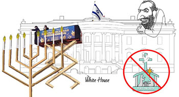 Where Christian motifs once stood in front of the White House and city halls, giant Jewish Menorahs became perfectly legal along Rabbis lighting it in Jewish rituals celebrating Jewish dedication to the preservation of their race, religion and culture in a ritual that DENIES OUR HERITAGE RELIGION AND CULTURE.