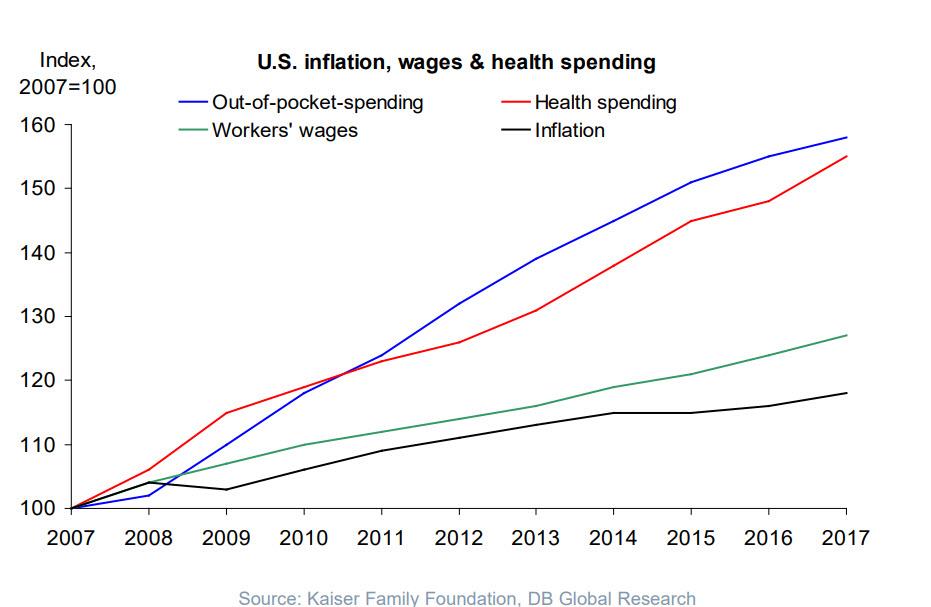 Overall, the increase in household healthcare spending has in the last decade far outstripped the increase in the general inflation, and wages out-of-pocket expenses leading the pack: