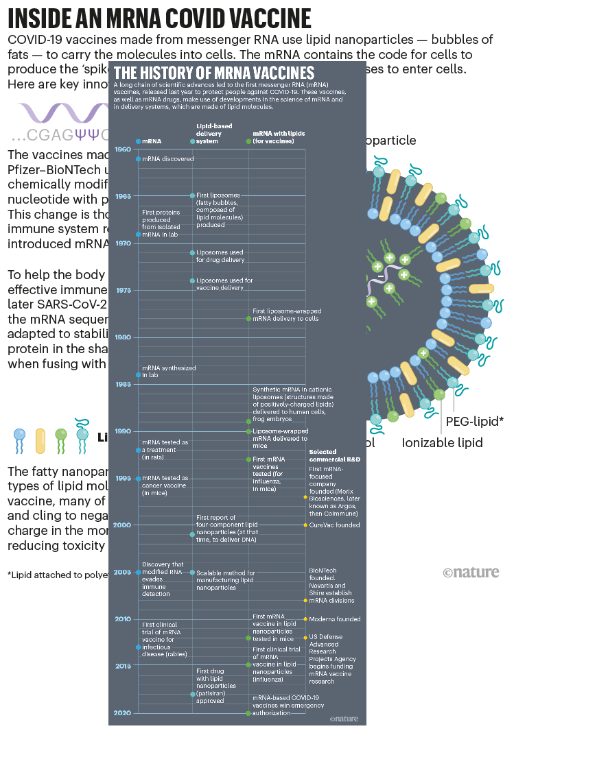 Malone’s experiments didn’t come out of the blue. As far back as 1978, scientists had used fatty membrane structures called liposomes to transport mRNA into mouse3 and human4 cells to induce protein expression. The liposomes packaged and protected the mRNA and then fused with cell membranes to deliver the genetic material into cells. These experiments themselves built on years of work with liposomes and with mRNA; both were discovered in the 1960s (see ‘The history of mRNA vaccines’).