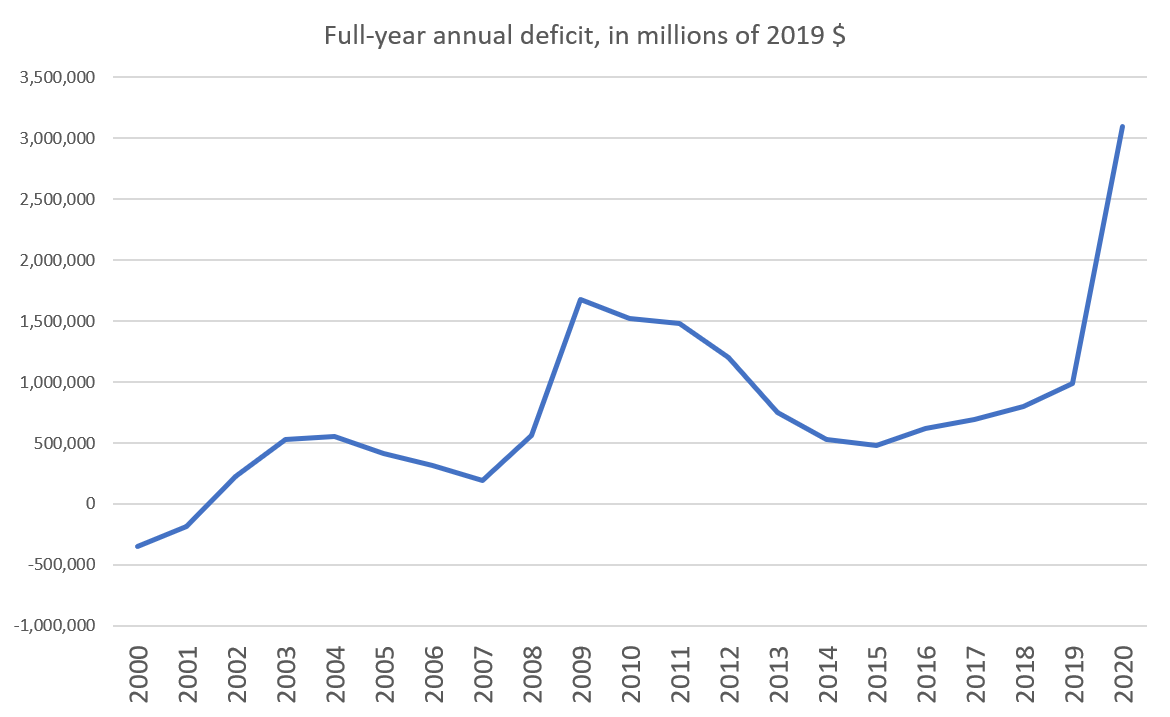 In the second graph, we see that the full-year deficit for the 2020 fiscal year was a record-breaking 3.1 trillion. This was far in excess of any previous year, even adjusted for inflation. During 2009, for example, the deficit reached “only” $1.4 trillion.