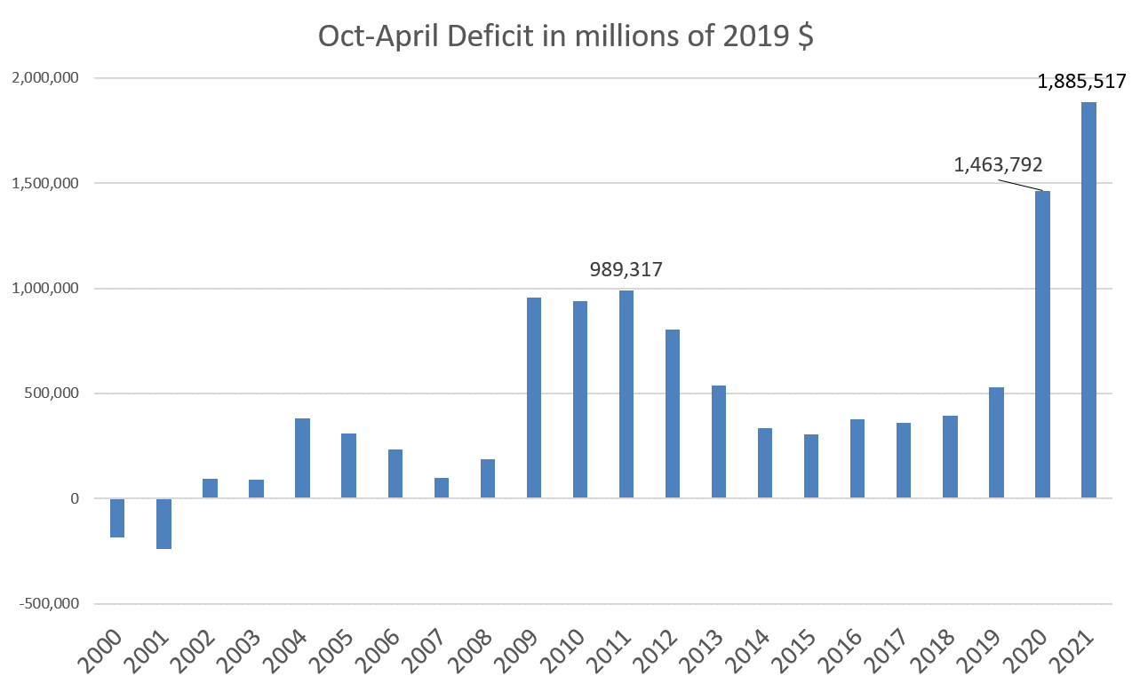 Put another way: for the first seven months of this fiscal year (2021), the total deficit already totals $1.9 trillion. During the same period of last year, this total was $1.5 trillion.