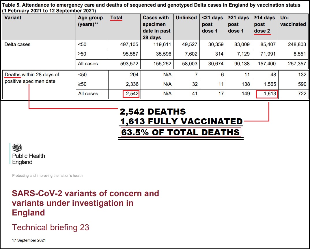 England’s Public Health Authority announces that the “vaccine” does not protect you from hospitalization and death. Fully vaccinated people account for 63.5% of Covid deaths:
