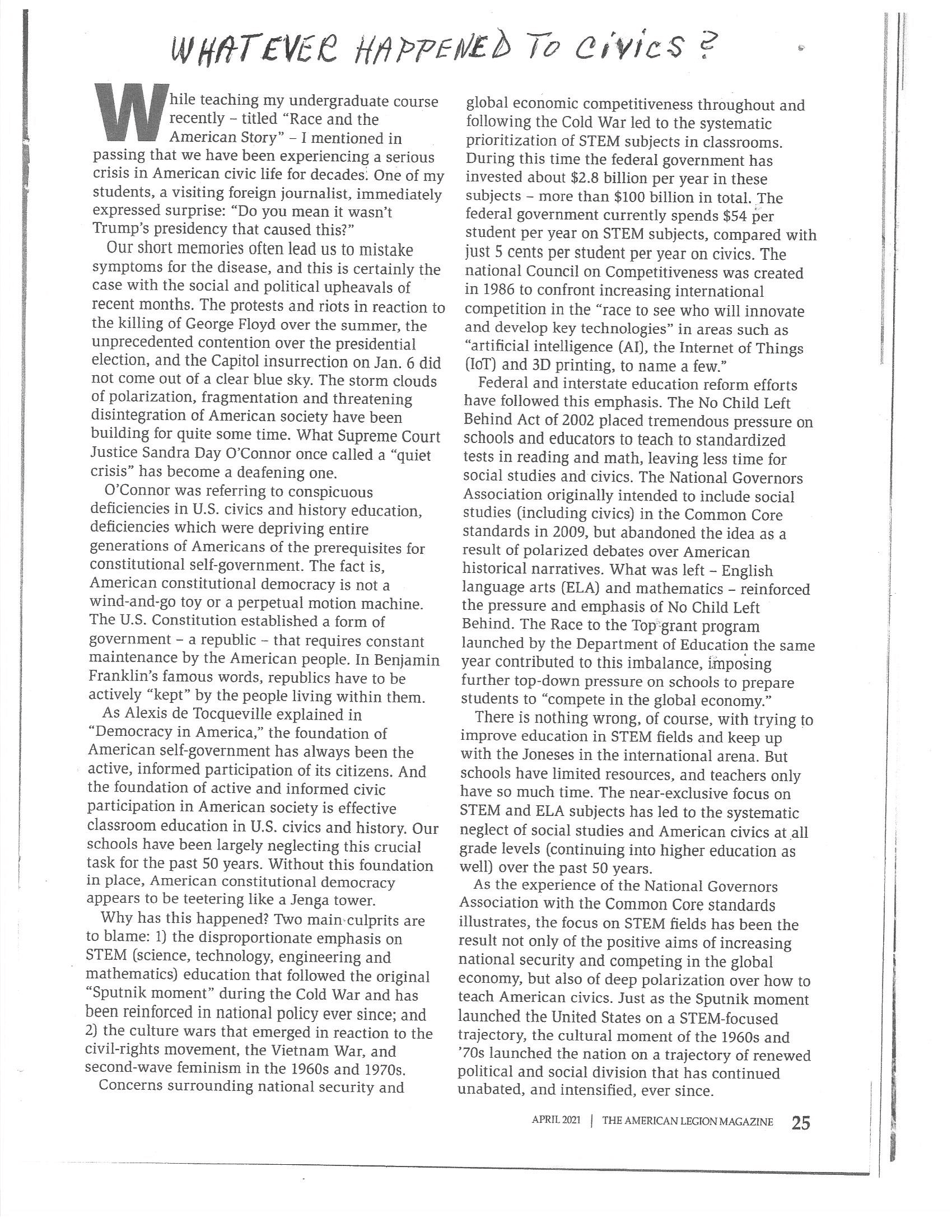 This article was in the Legion magazine for April, and Prof. Seagrave does a great job explaining the who, what, and why of the teaching of civics in our schools (which I taught back in the 60’s!).