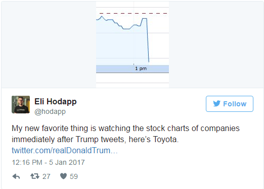 I’m severely torn over President-elect Trump threatening companies into bringing back plants and jobs to the US. On the one hand, I want that to happen and I can’t help but go… YES!, every time he does this. But the constitutional side of me gets the willies. I abhor protectionism and I have always embraced open market capitalism. There is no denying what Trump does and says however, gets results. Look at the stock market for instance. All he has to do is speak out against or reprimand a company and their stocks tank. Toyota found that out the hard way this week.