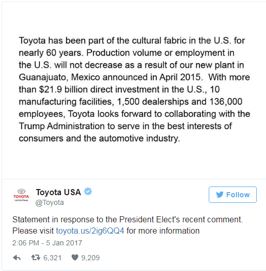 Agree or disagree, we have never seen a President like Donald J. Trump and he’s going to shake everything up. I suggest Toyota consider their next moves and options carefully. Don’t choose poorly.